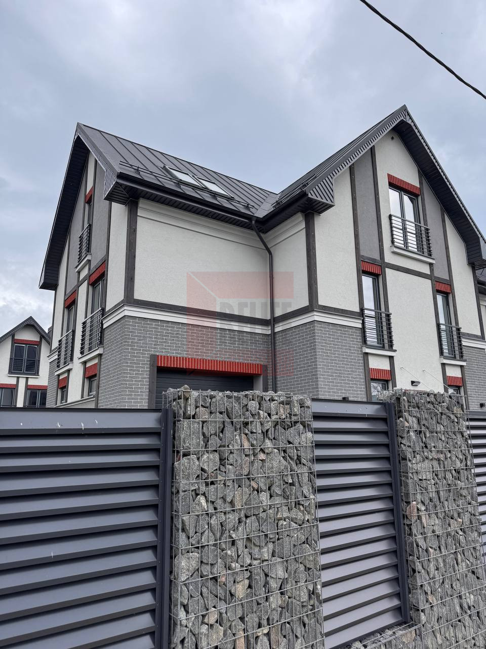 Комбинированная облицовка фасада: штукатурка и керамическая плитка «KING KLINKER», декоративные элементы с кварцевым покрытием.