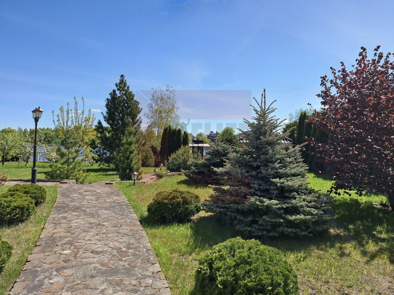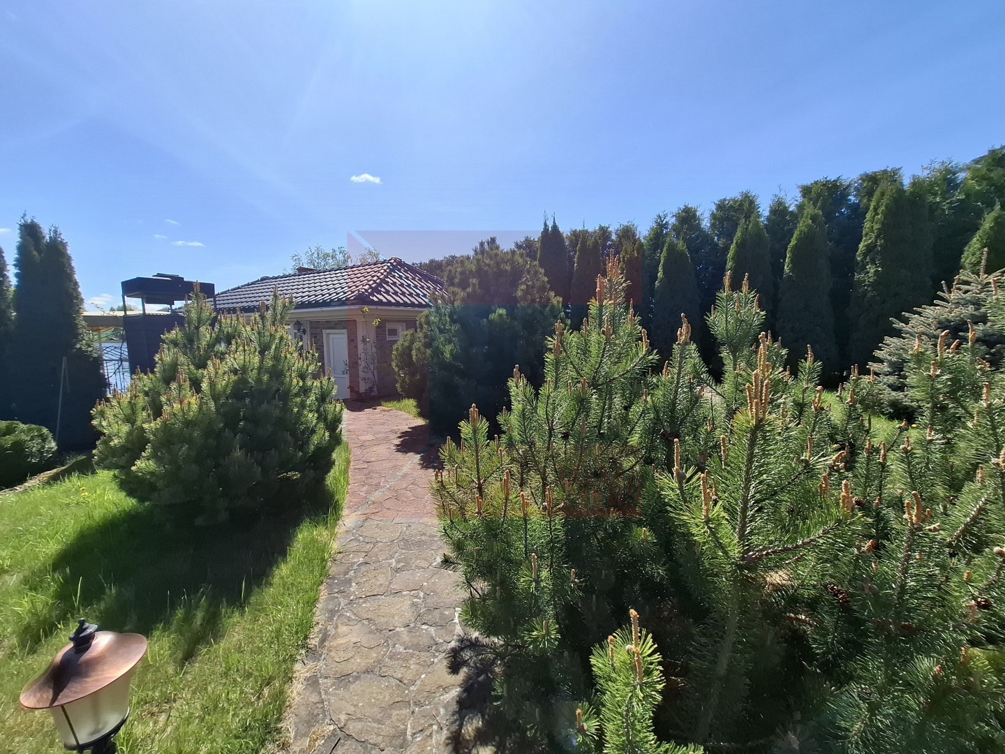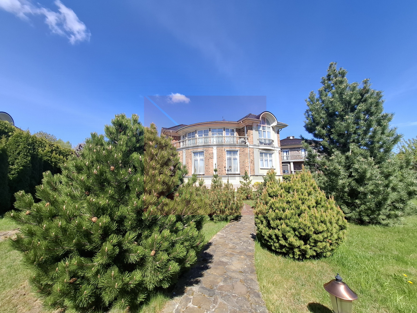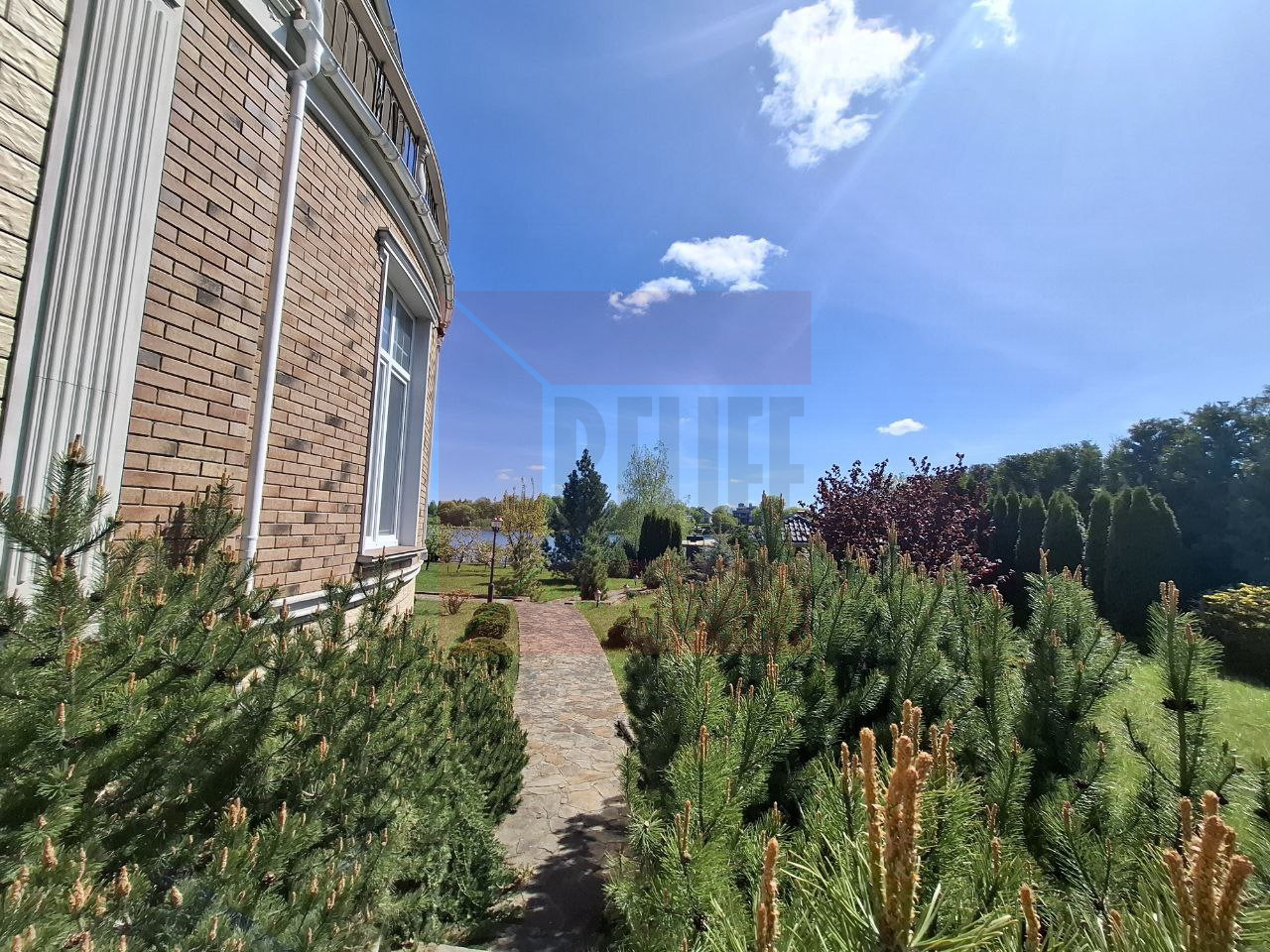 Коттедж расположился на земельном участке 12 соток. Выполнен ландшафтный дизайн.