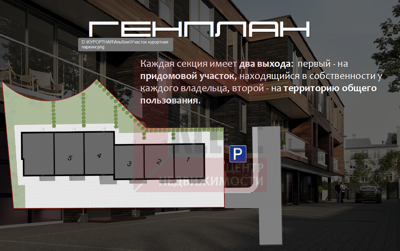 * Участок: К каждой секции таунхауса относится частный огороженный земельный участок площадью 1.5 сотки с ландшафтным дизайном. Имеется общая территория и гостевая парковка.