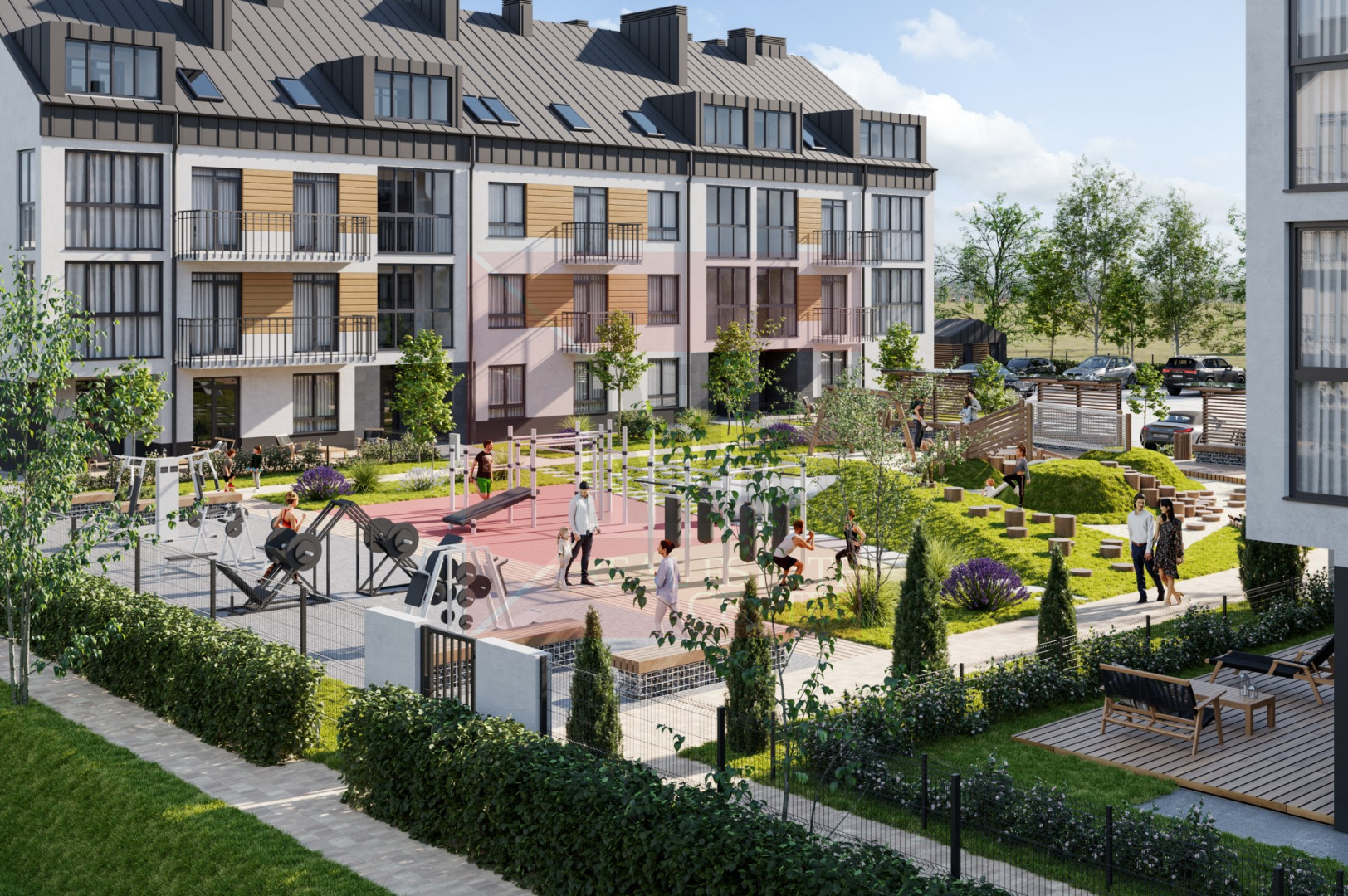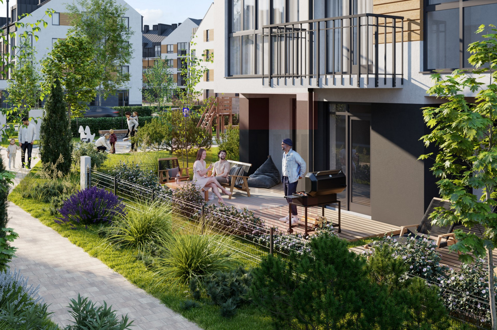 Во дворе располагаются современные детские площадки. Дом оборудован видеокамерами и домофоном. Кладовые, которые находятся на территории комплекса S каждой по 5,7 м2.