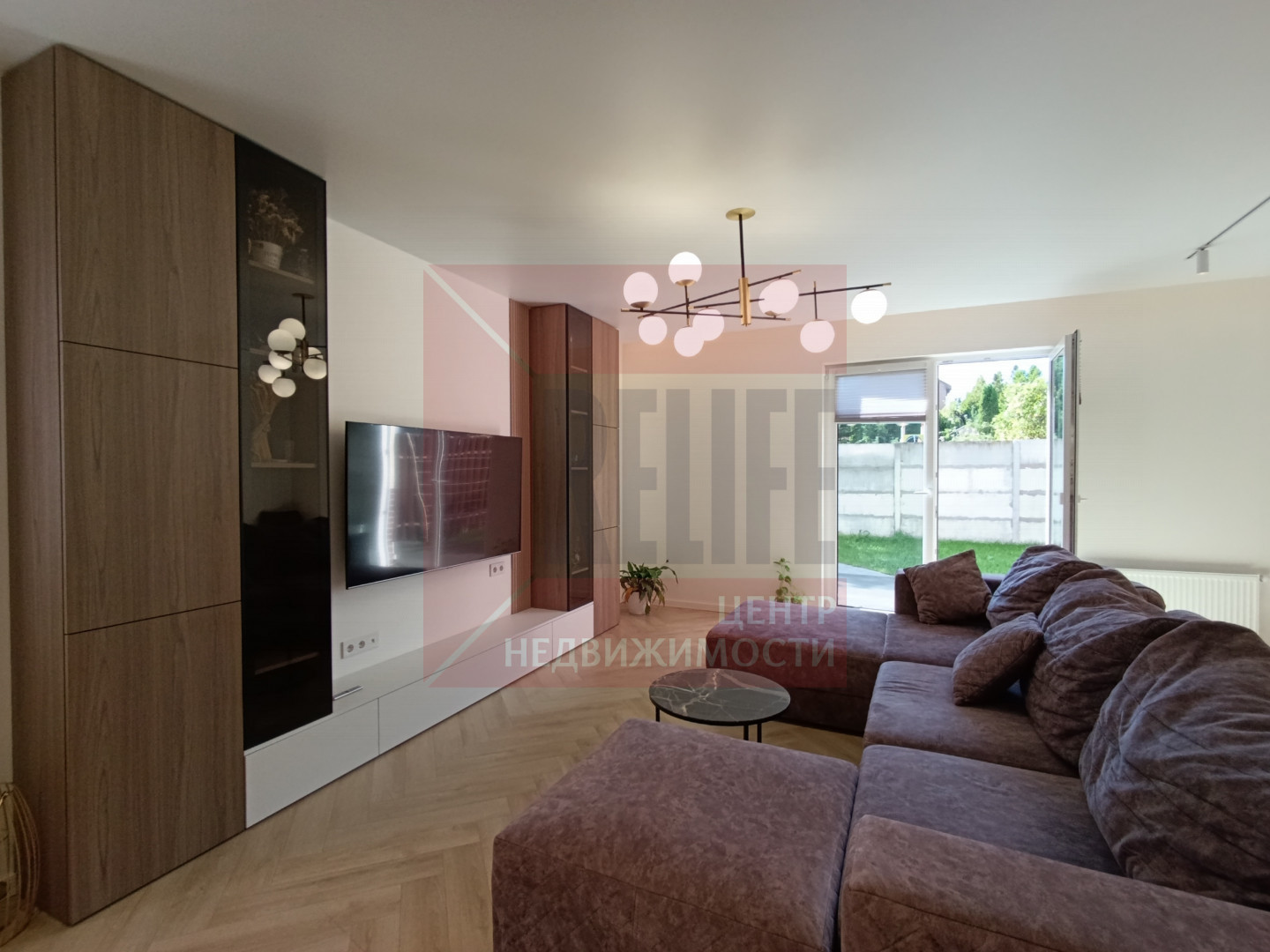 Большая гостиная с выходом на ухоженную территорию, где обустроена зона барбекю и отдыха.