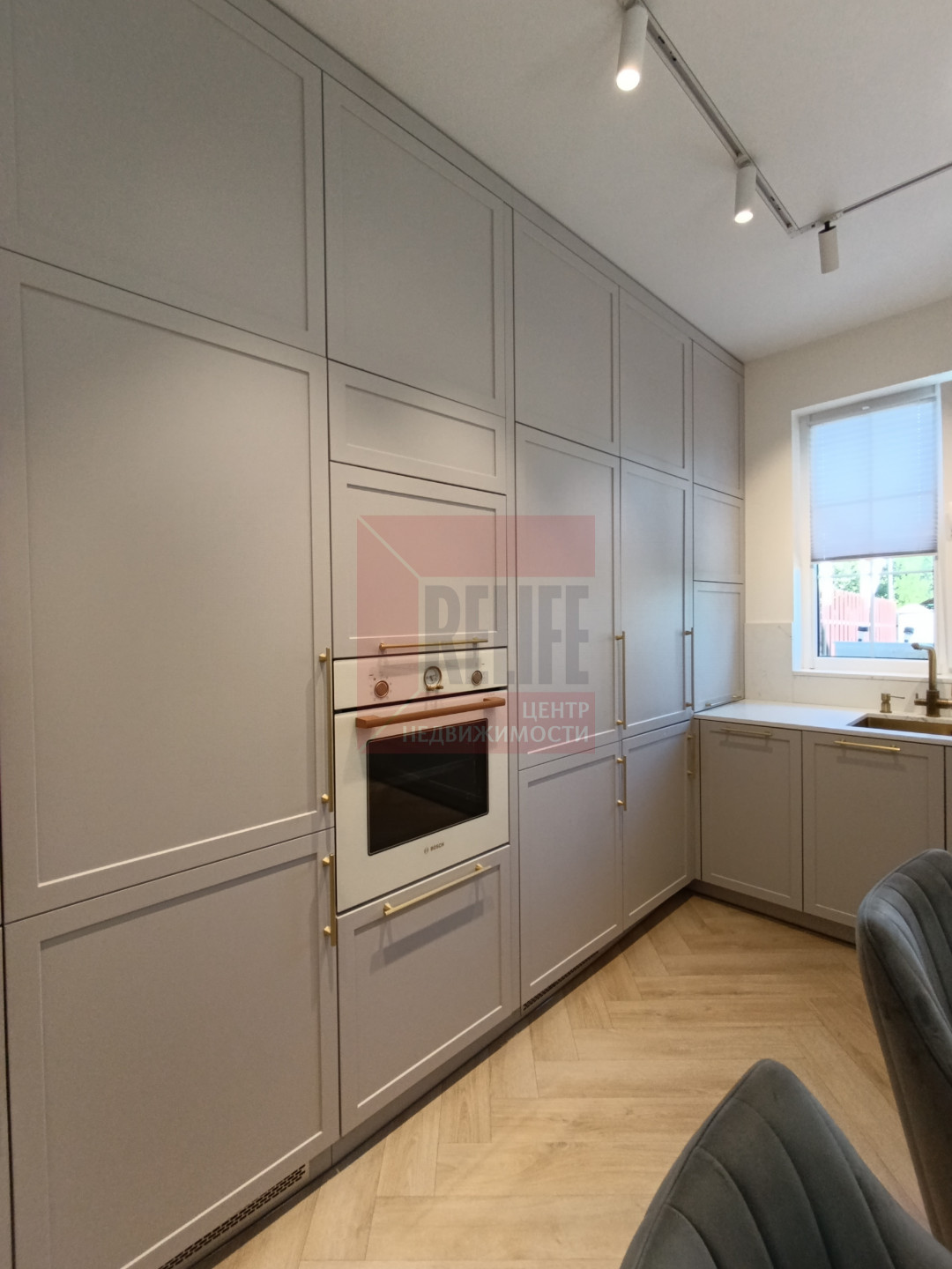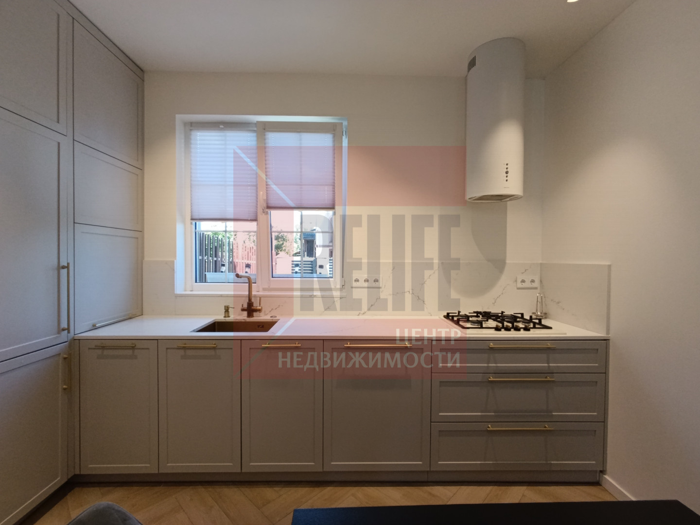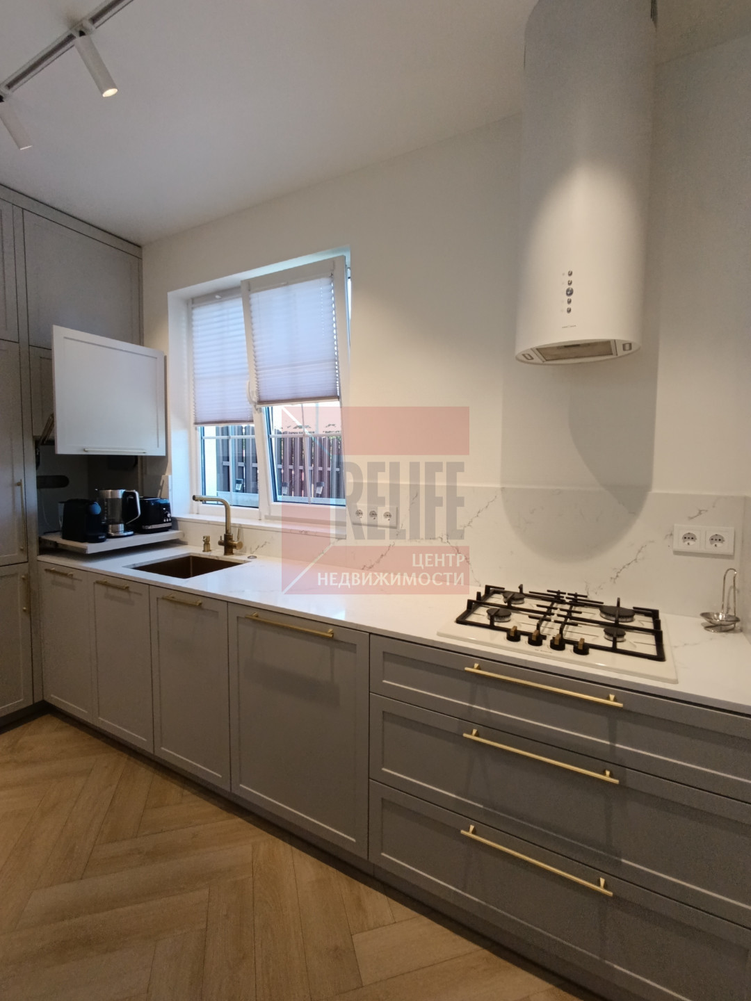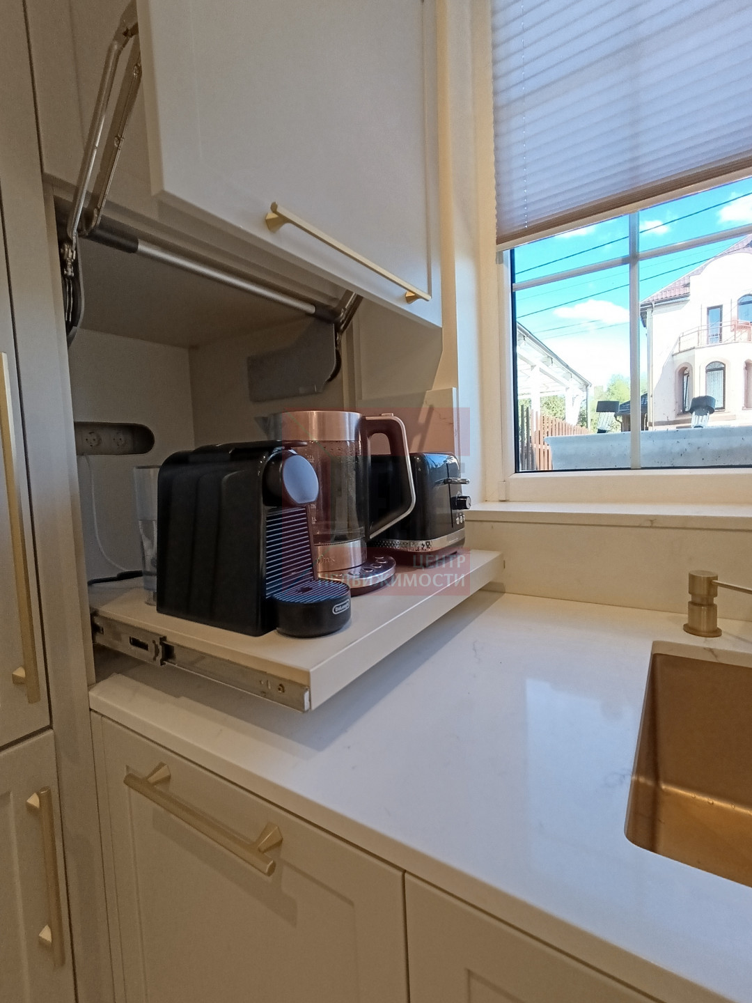 На первом этаже расположена зона кухни, оборудованная современной техникой: встроенный холодильник, встроенная морозильная камера, микроволновая печь, посудомоечная машина, измельчитель отходов, фильтр для воды, кофемашина и другая мелкая бытовая техника.