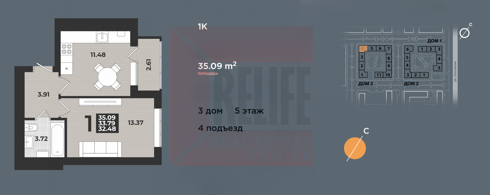 Общая площадь квартиры 35,09 кв. м, спальня 13,37 кв. м. с выходом на лоджию в 2,61 кв. м., кухня-гостиная 13,37 кв. м., холл 3,91 кв. м., ванная комната 3,72 кв. м.