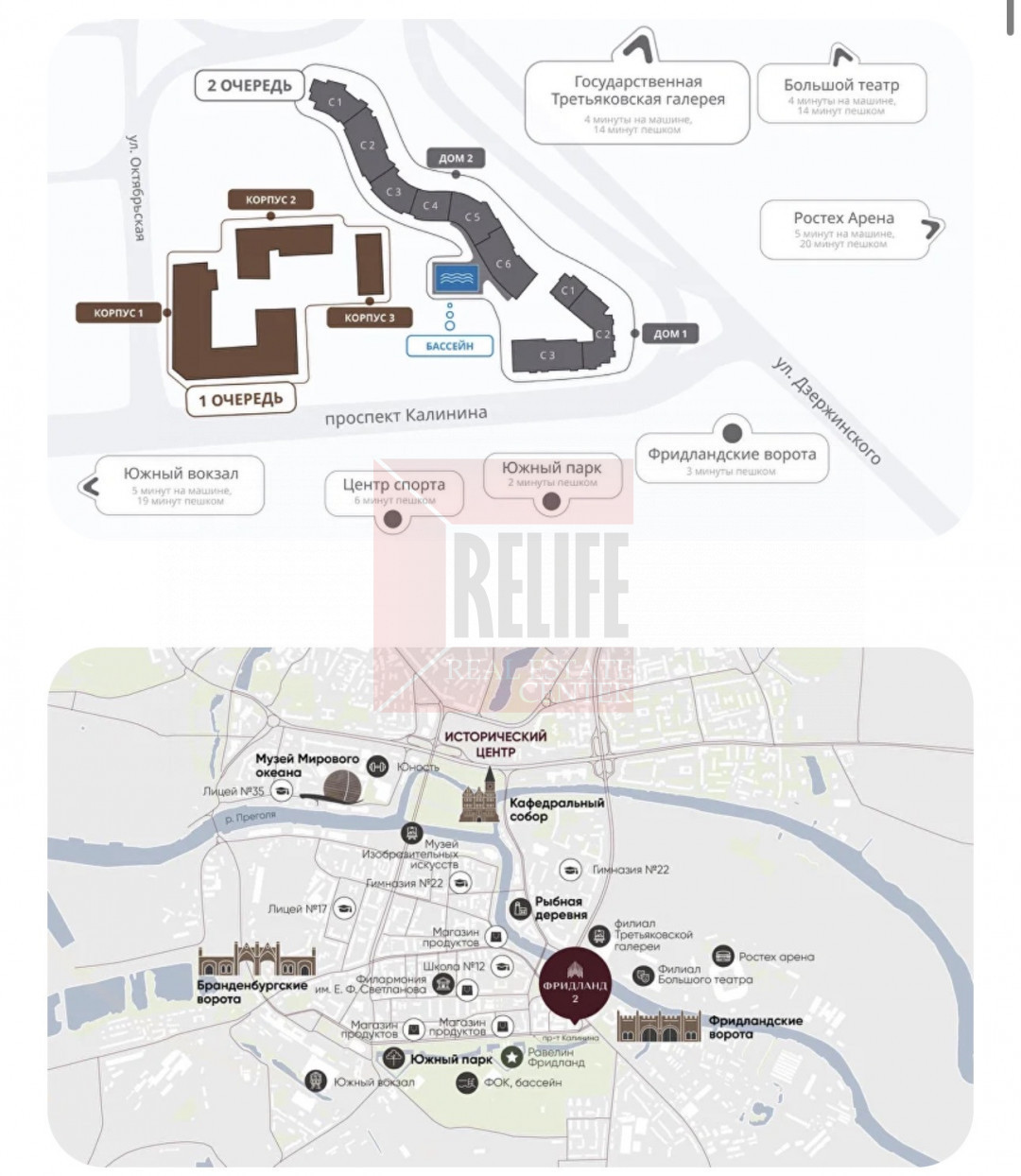 Комплекс окружен городскими достопримечательностями: Южный парк, набережная Рыбной деревни, остров Канта, филиалы Третьяковской галереи и Большого театра, музей Фридландские ворота.