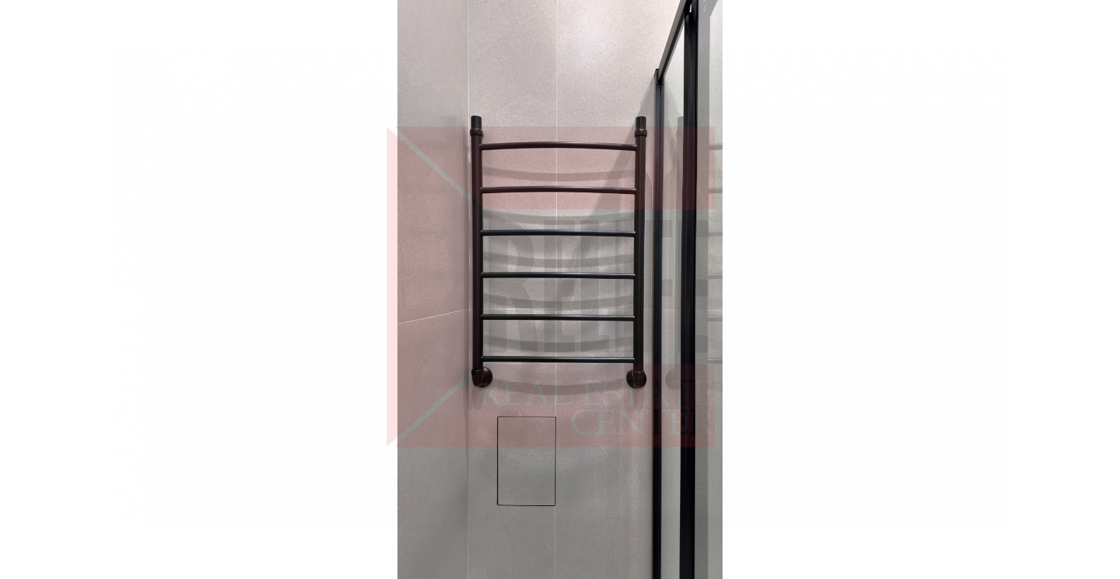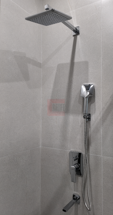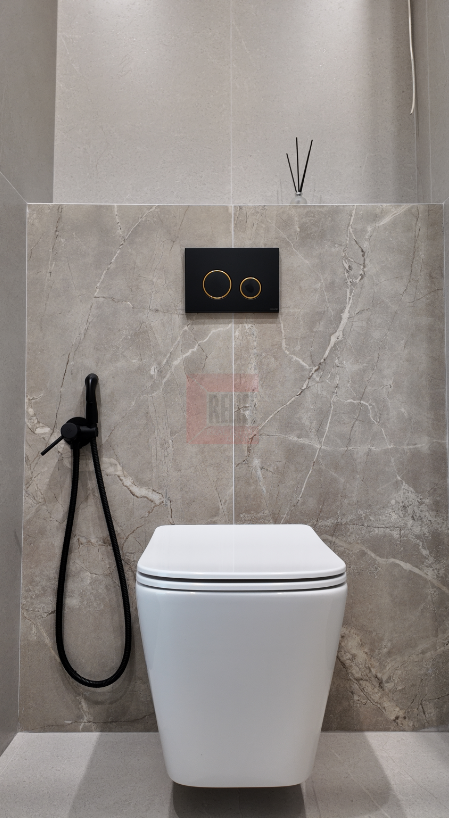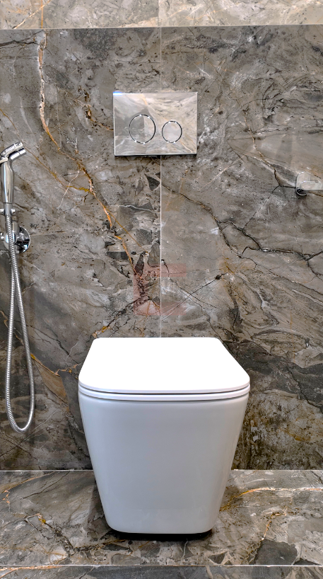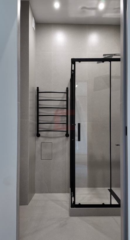 - Санузлы: Крупноформатный керамогранит под металл, душевые перегородки из закалённого стекла, подогрев пола.
