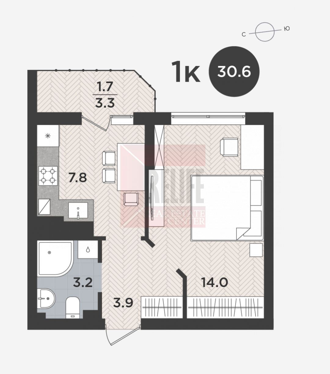 Планировка квартиры функциональна. Общая площадь квартиры 30.6 кв. м, комната 14 кв. м., кухня 7.8 кв. м., ванная комната, холл с предусмотренной зоной хранения.