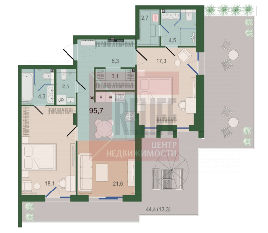 Площадь: 95,7 м² (жилая — 35, м², кухня — 21,9 м²)