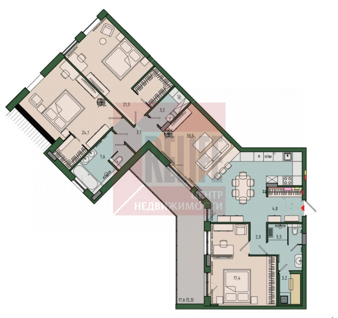 Площадь: 131,6 м² (жилая — 62,8 м², кухня — 33,5 м²)