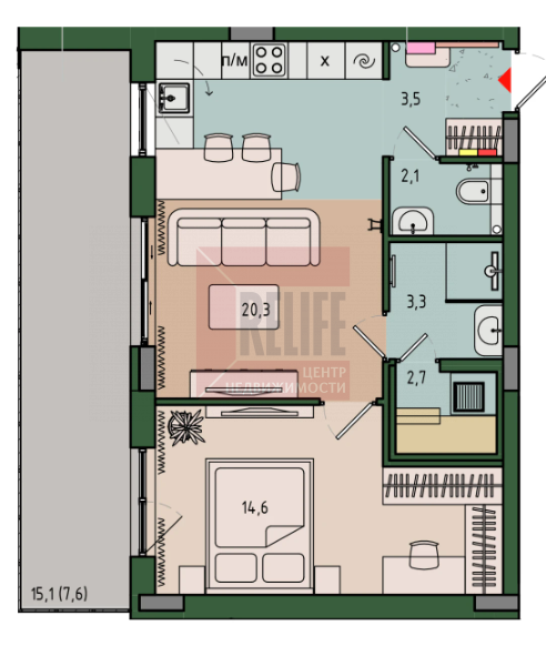 Площадь: 54.1 м² (жилая —14.6 м², кухня — 20.3 м²).
