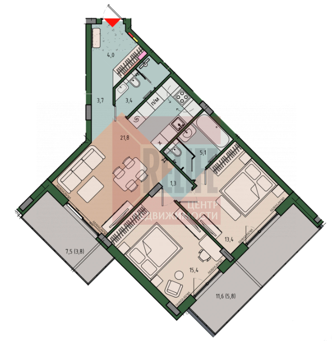 Площадь: 77,7 м² (жилая — 28,8 м², кухня — 21,8 м²)