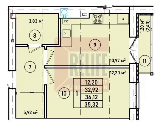 • Площадь 34,12 м², современная планировка.