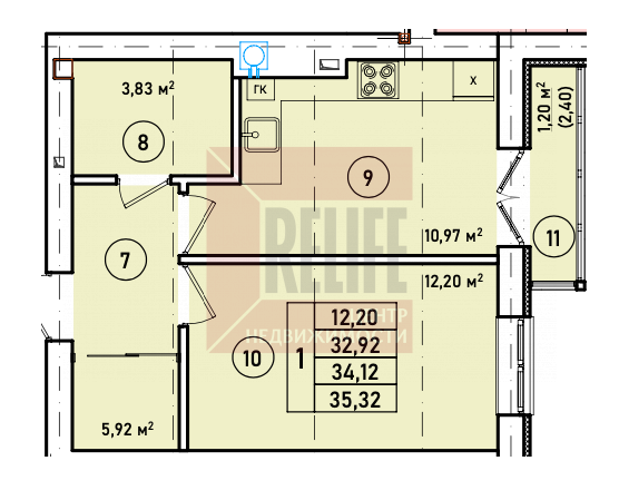 • Площадь 34,12 м², современная планировка.