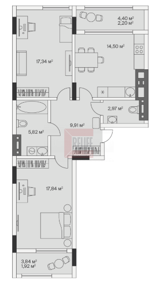 Площадь квартиры 73.2 м2 без отделки. Есть возможность заказать ремонт "под ключ" у застройщика.