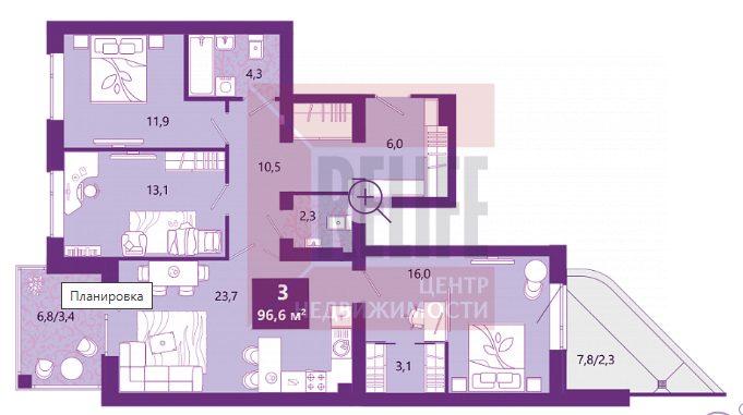 Общая площадь 97,5м2 имеется балкон, совмещенный санузел. В квартире автономное отопление.