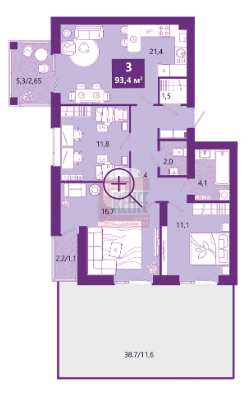 Общая площадь 93,4м2 имеется балкон, совмещенный санузел. В квартире автономное отопление.