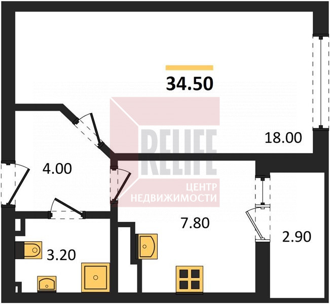Планировка квартиры функциональна. Общая площадь квартиры 34.5 кв. м, комната 18.00 кв. м., кухня 7,8 кв. м., ванная комната, холл с предусмотренной зоной хранения.