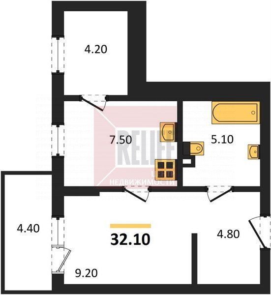 Планировка квартиры функциональна. Общая площадь квартиры 32,1кв. м, комната 9,2 кв. м., кухня 7,5 кв. м., ванная комната, холл с предусмотренной зоной хранения.