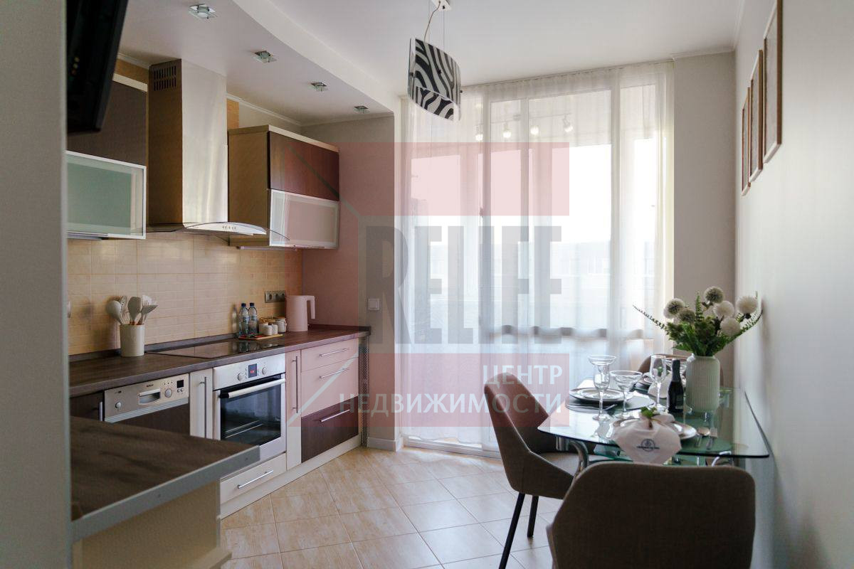 Современный кухонный гарнитур со встроенной техникой, обеденная зона у окна — идеальное место для завтраков и уютных вечеров.