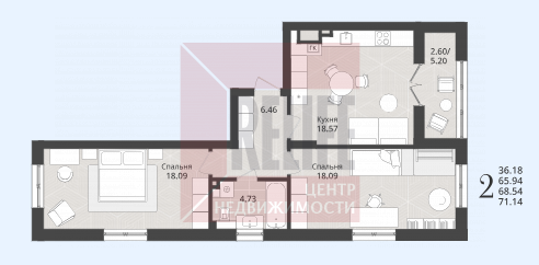 Квартира, 2-к, 69 кв.м., 2 эт.