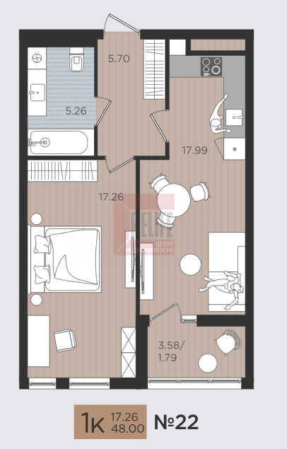 Квартира, 1-к, 48 кв.м., 6 эт.