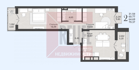 Квартира, 2-к, 65 кв.м., 2 эт.