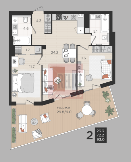 В квартире: Свободная планировка (72,2 м²), с просторной террасой (29,8м2), гардероб.