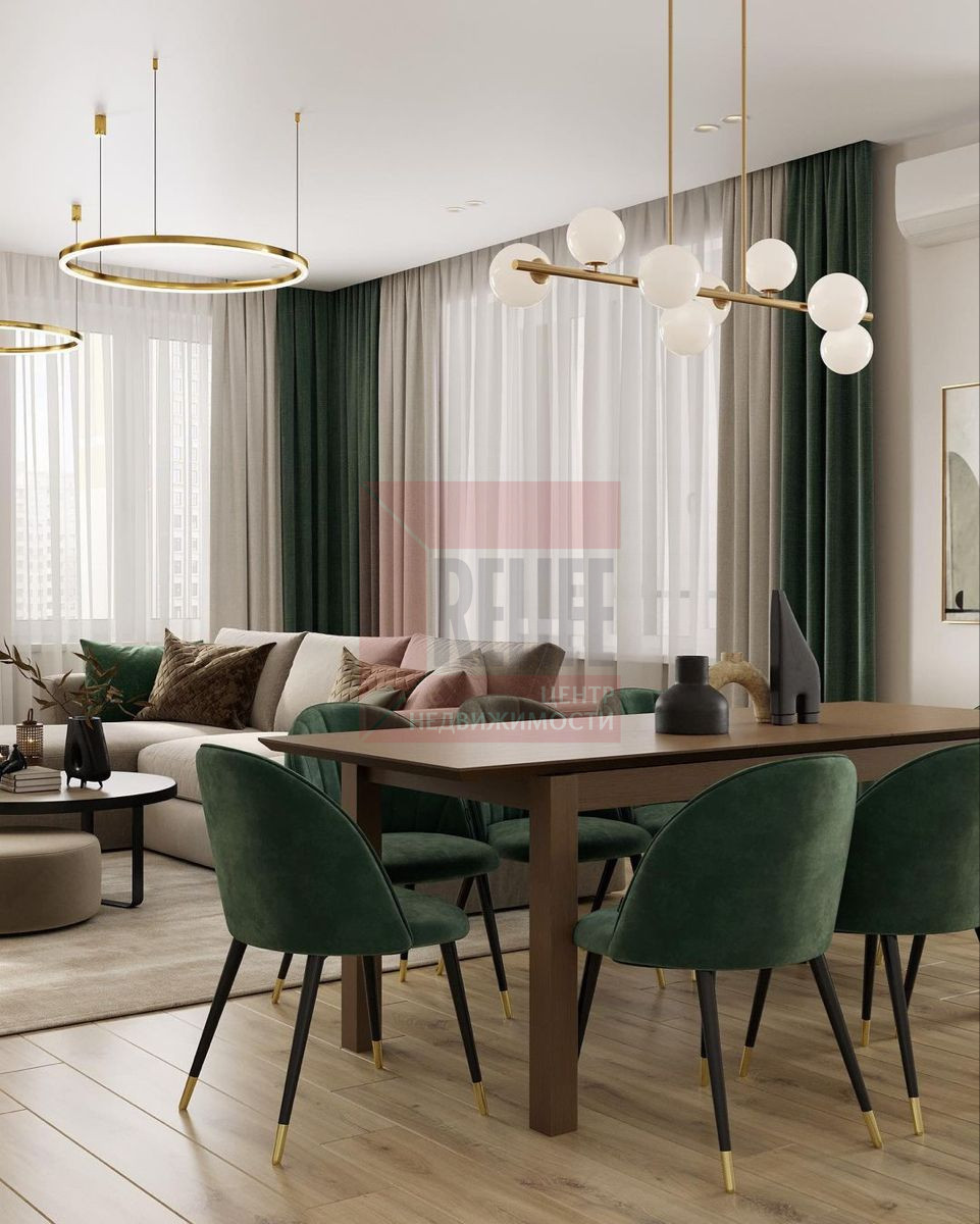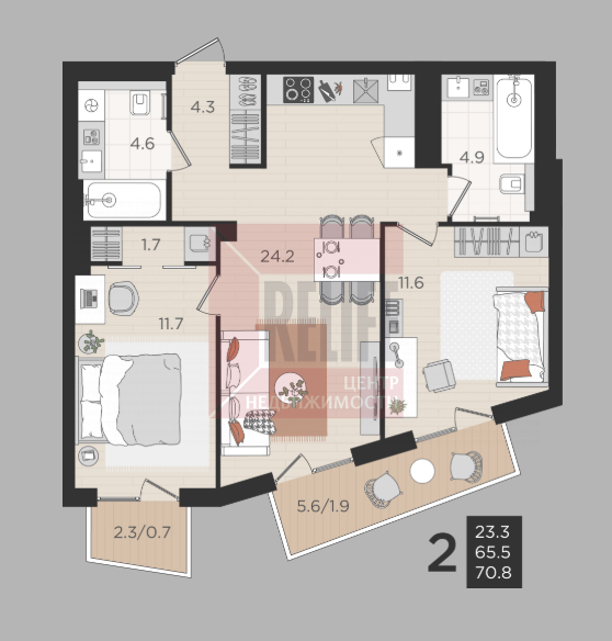 В квартире: Свободная планировка (65,5 м²), с просторной террасой и балконом.