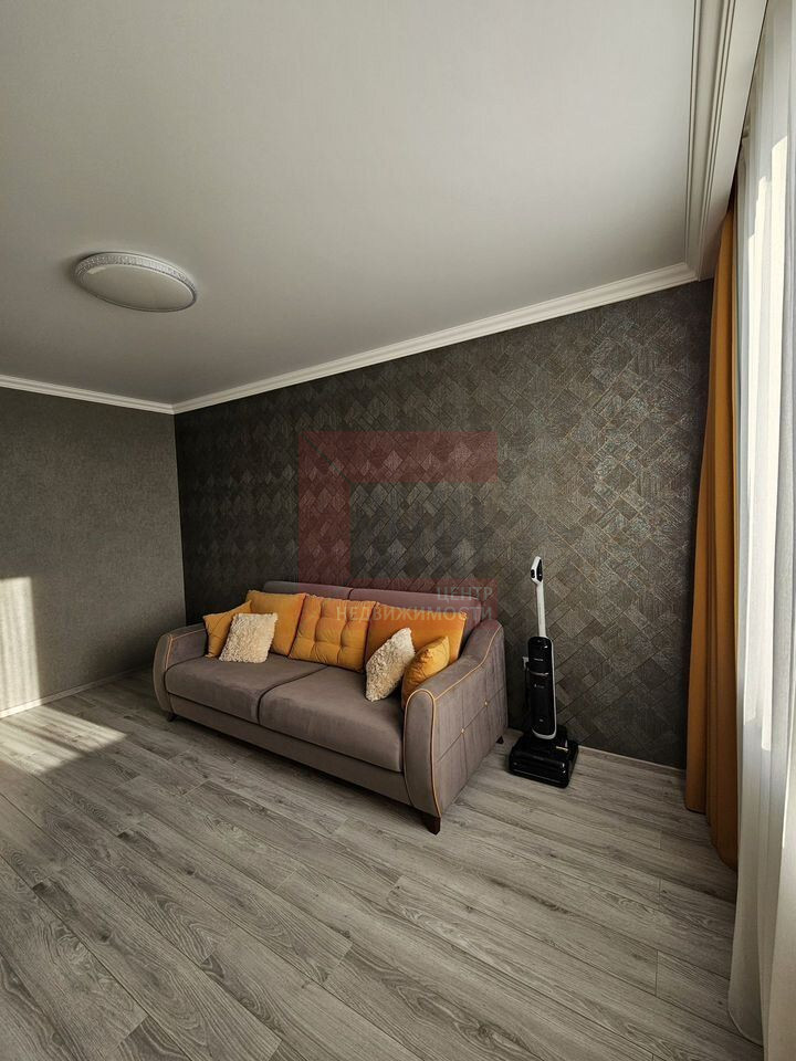 Просторная гостиная с панорамными окнами и стильной отделкой. Из окон открывается вид на тихий двор с обустроенной спортивной площадкой. Изолированные комнаты обеспечивают полную приватность.