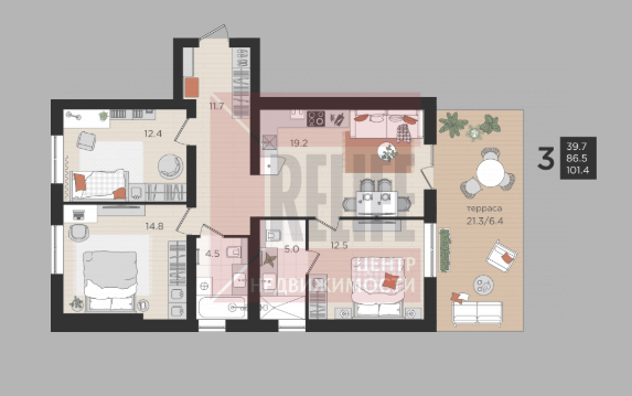 В квартире: Свободная планировка (46,2 м²) с просторной террасой 6,1м2.