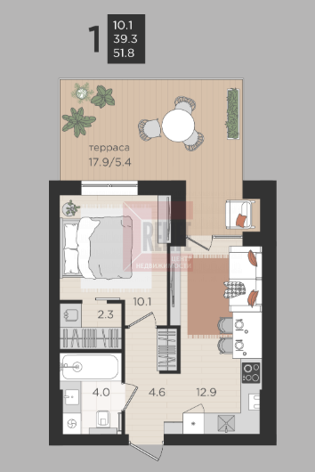 В квартире: Свободная планировка (39,3 м²) с просторной террасой 17,9м2.