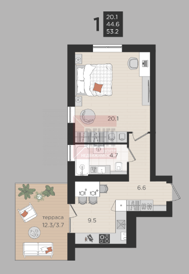 В квартире: Свободная планировка (44,6 м²) с просторной террасой 20,1м2.
