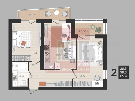 В квартире: Свободная планировка (59,3м²) с лоджией и балконом.