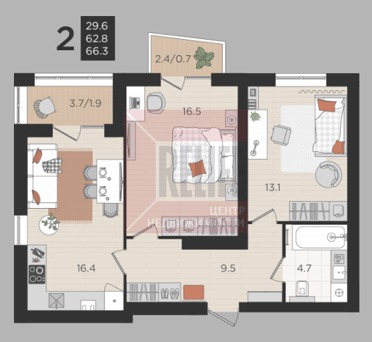 В квартире: Свободная планировка (62,8м²) с балконом и лоджией.