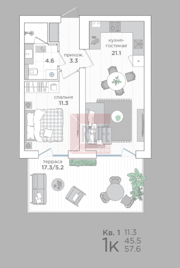 В квартире: Свободная планировка (45,5 м²) с просторной террасой 17,3м2.