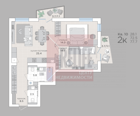 В квартире: Свободная планировка (72,5м²) с двумя балконами.