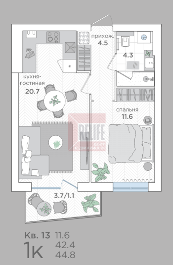 В квартире: Свободная планировка (42,2 м²) с балконом.