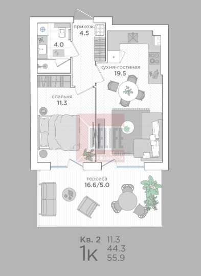В квартире: Свободная планировка (44,3 м²) с просторной террасой 16,6м2.