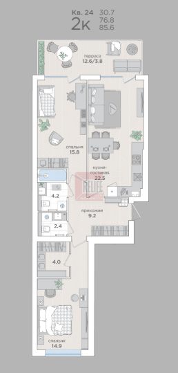 В квартире: Свободная планировка (76,8м²) с просторной террасой 12,6м2.