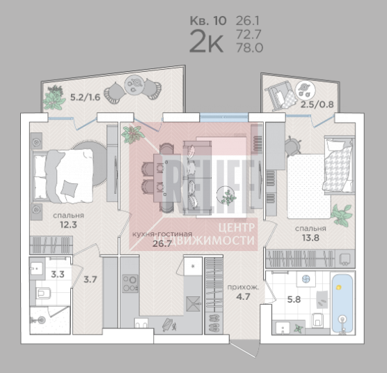 В квартире: Свободная планировка (72,7м²) с двумя балконами.