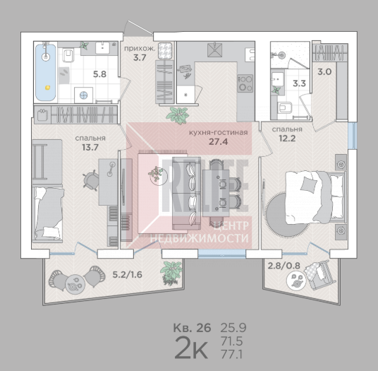В квартире: Свободная планировка (71,5м²) с двумя балконами.