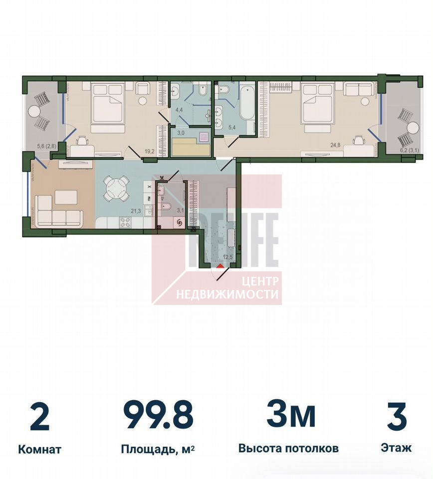 — две просторные спальни 19.2 и 24.8