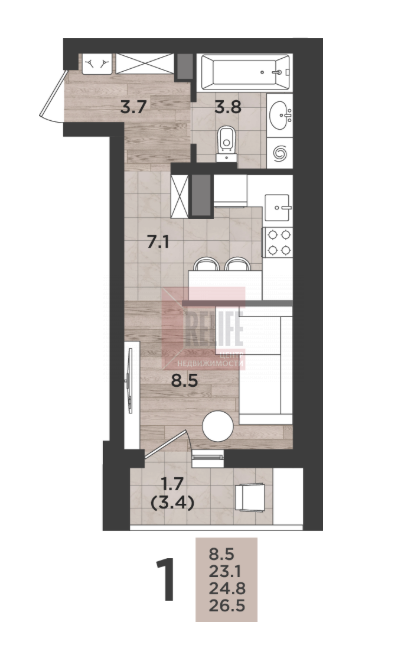 - Отделка «серый ключ» + высота потолков 2,7 м.