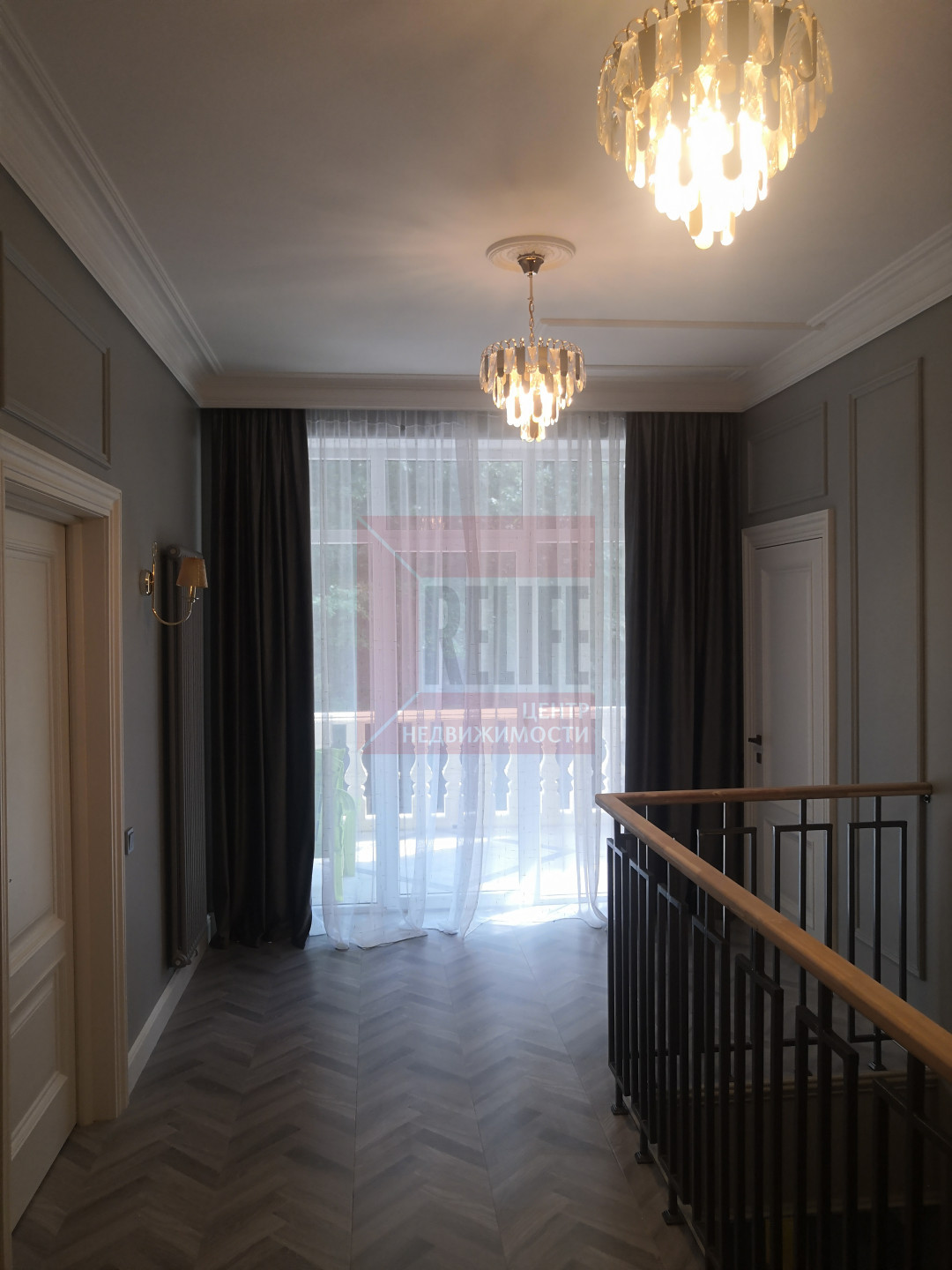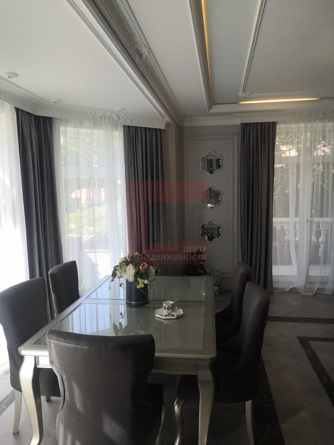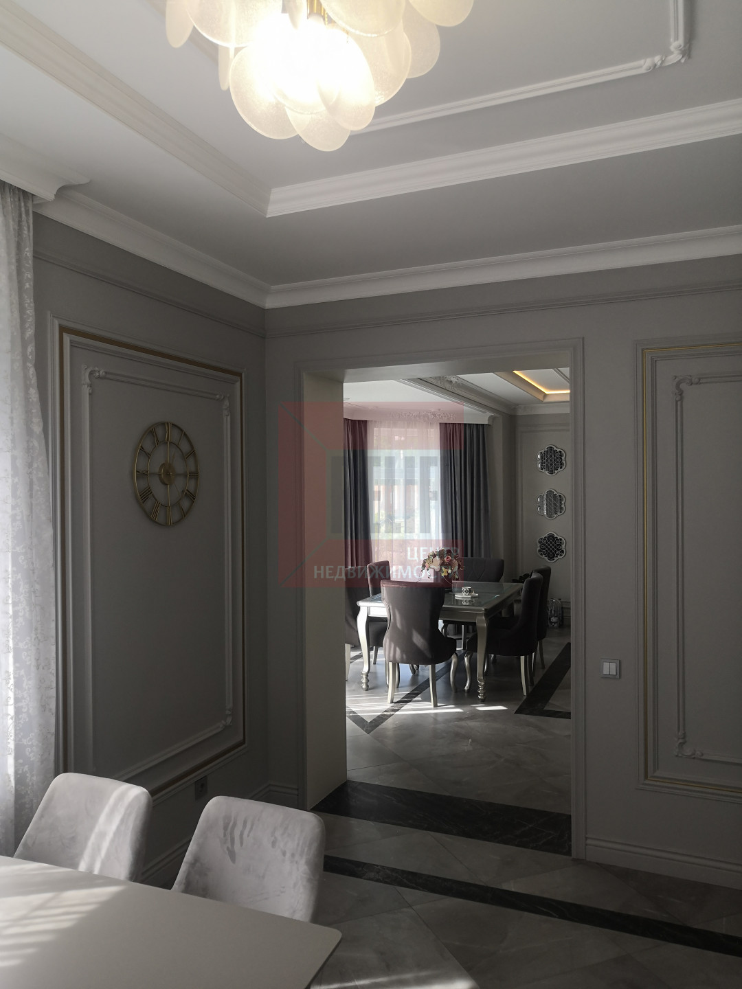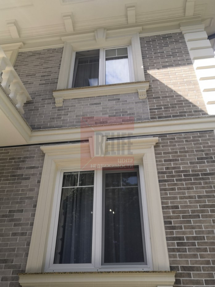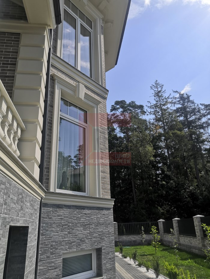 В доме выполнен дизайнерский ремонт в неоклассическом стиле, главная черта которого - это гармоничное сочетание традиций и инноваций. Неоклассика взяла из классических интерьеров склонность к использованию натуральных материалов, в интерьере использовались такие материалы как натуральное дерево и камень. Благодаря панорамному остеклению и высоким потолкам весь дом наполняется светом.