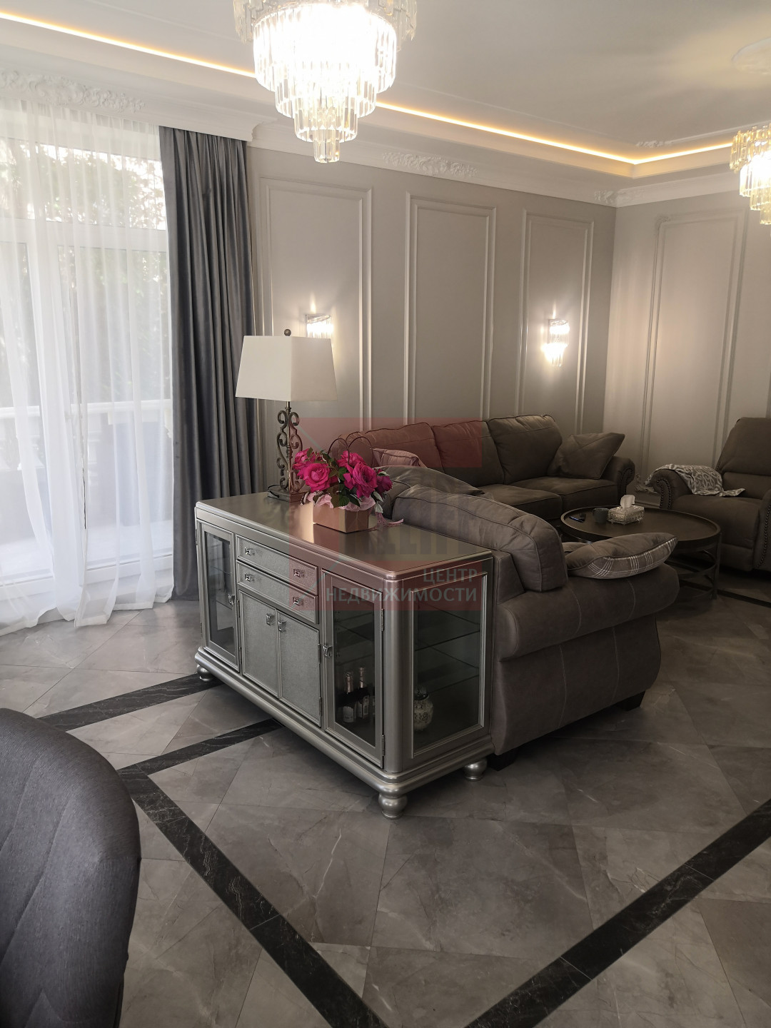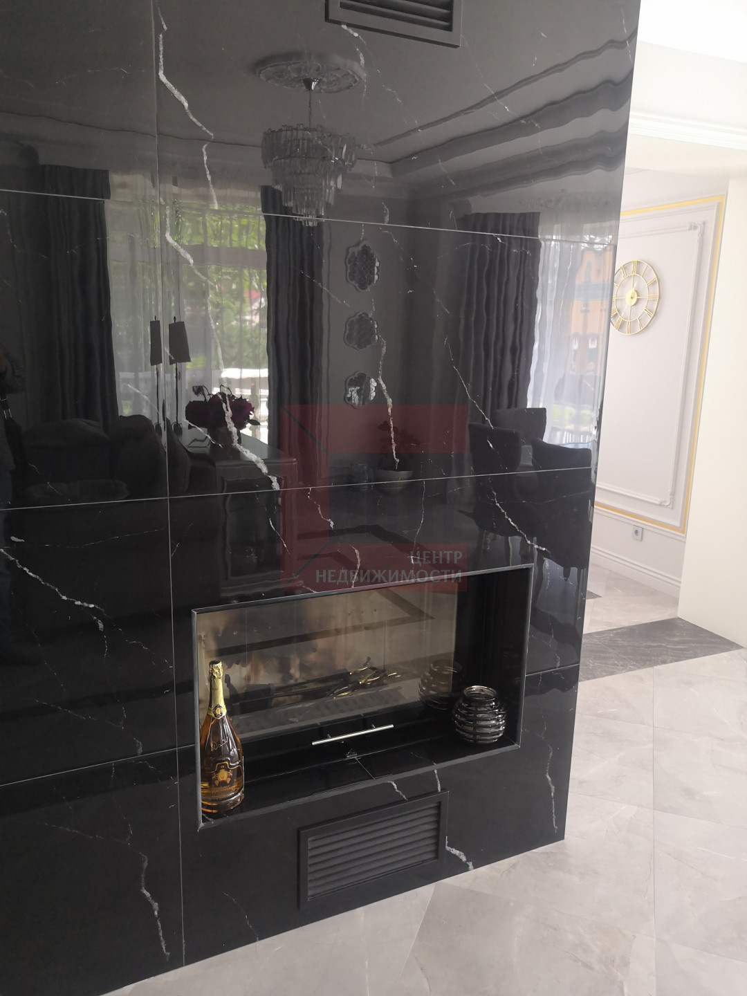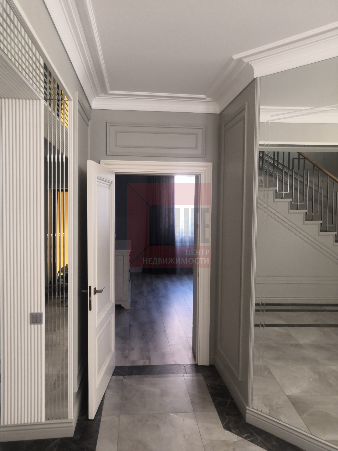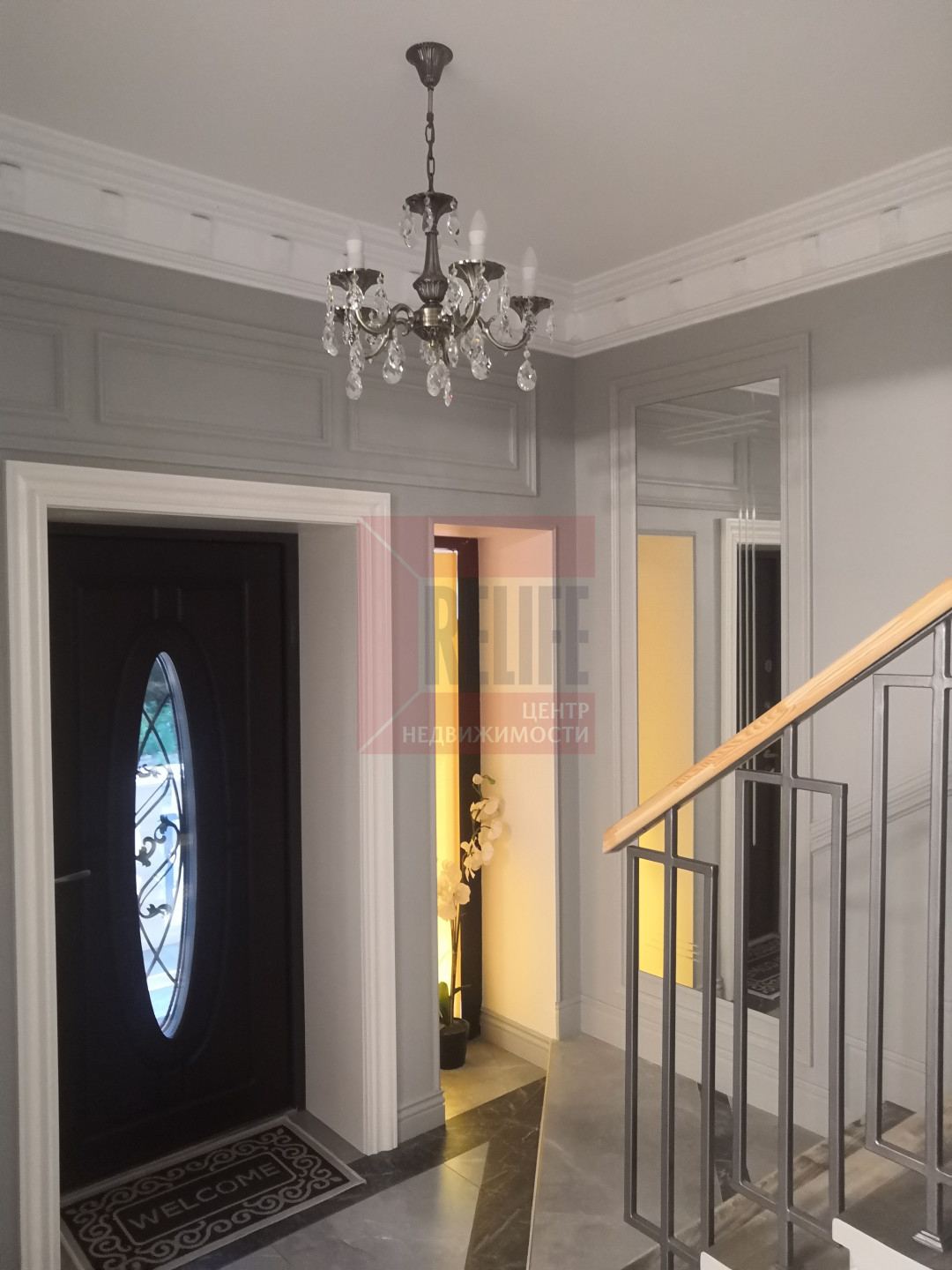 В доме выполнен дизайнерский ремонт в неоклассическом стиле, главная черта которого - это гармоничное сочетание традиций и инноваций. Неоклассика взяла из классических интерьеров склонность к использованию натуральных материалов, в интерьере использовались такие материалы как натуральное дерево и камень. Благодаря панорамному остеклению и высоким потолкам весь дом наполняется светом.