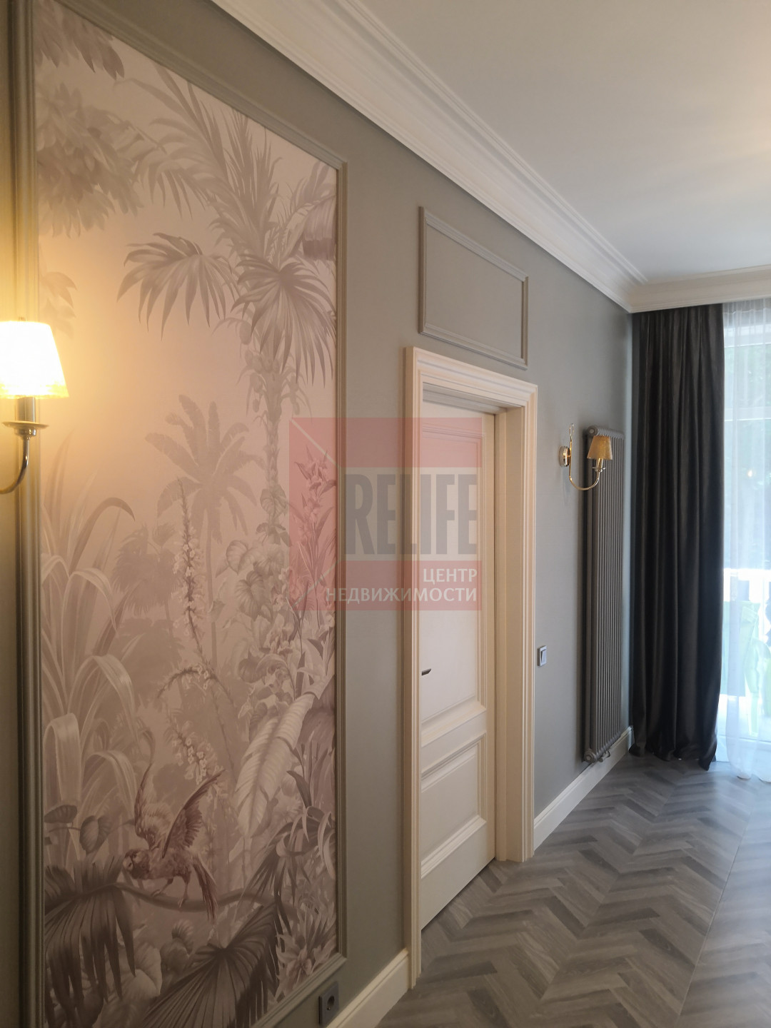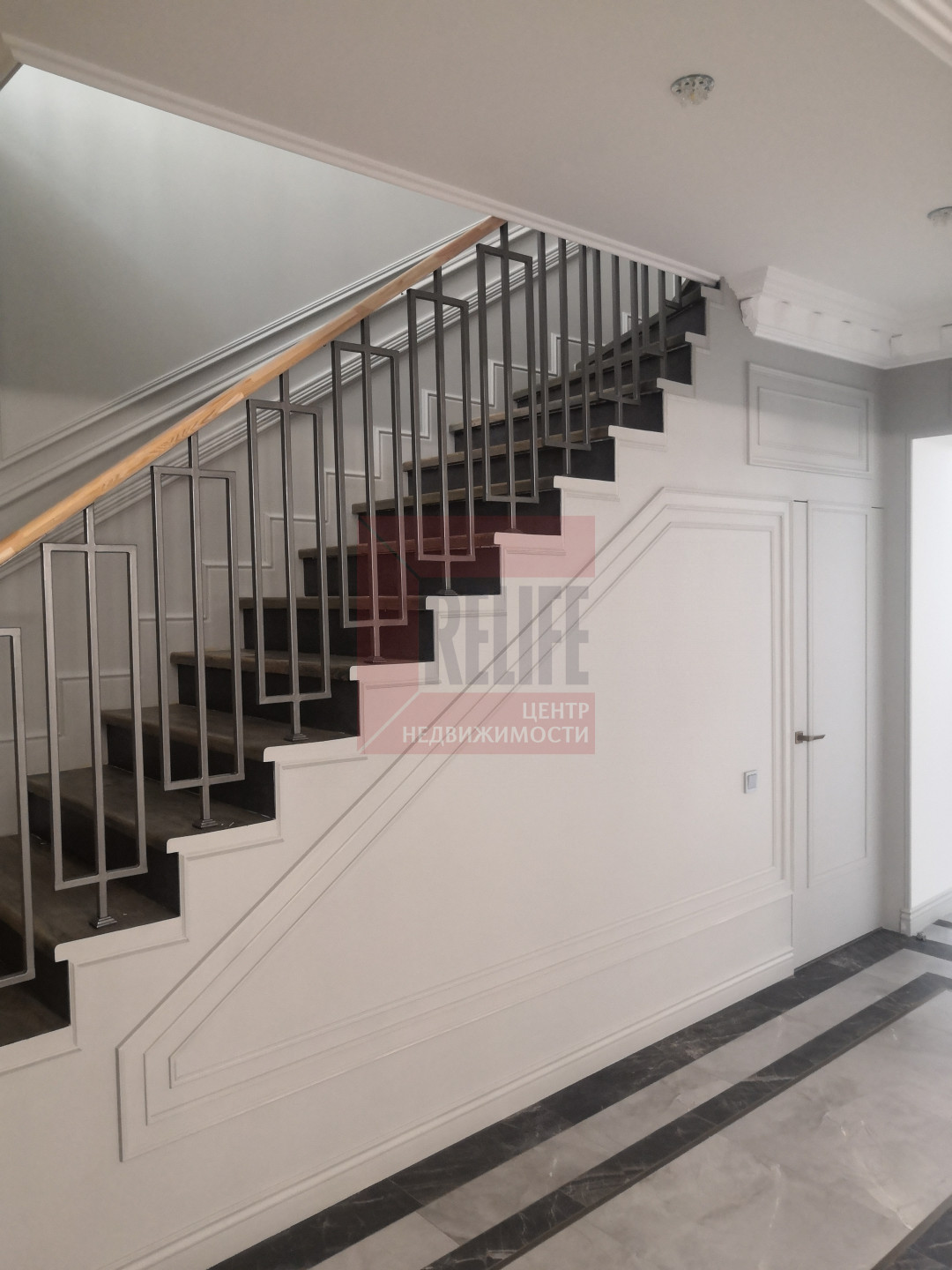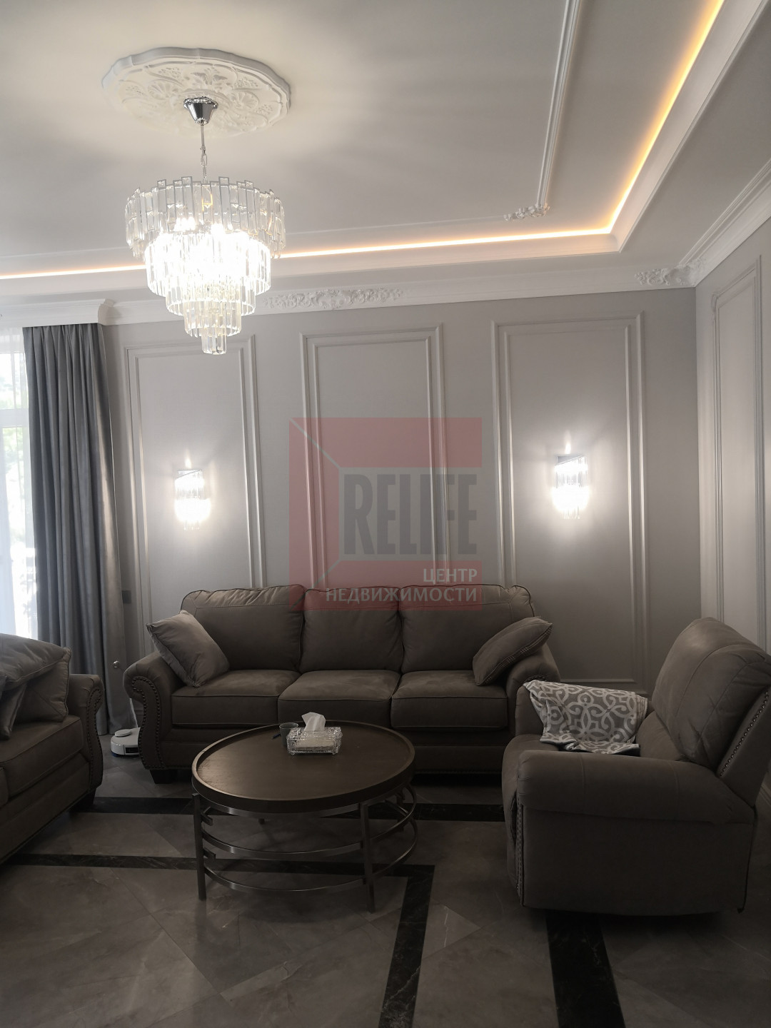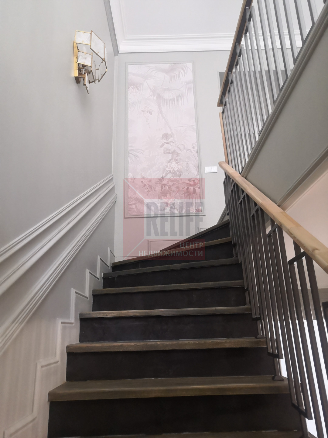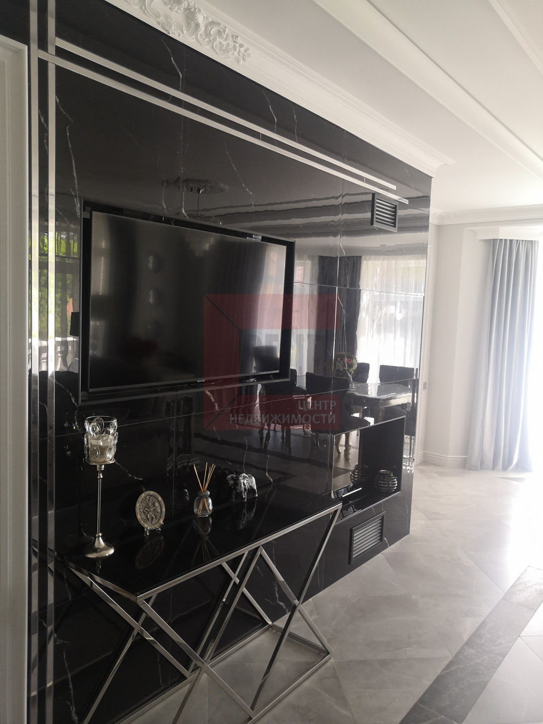 В доме выполнен дизайнерский ремонт в неоклассическом стиле, главная черта которого - это гармоничное сочетание традиций и инноваций. Неоклассика взяла из классических интерьеров склонность к использованию натуральных материалов, в интерьере использовались такие материалы как натуральное дерево и камень. Благодаря панорамному остеклению и высоким потолкам весь дом наполняется светом.