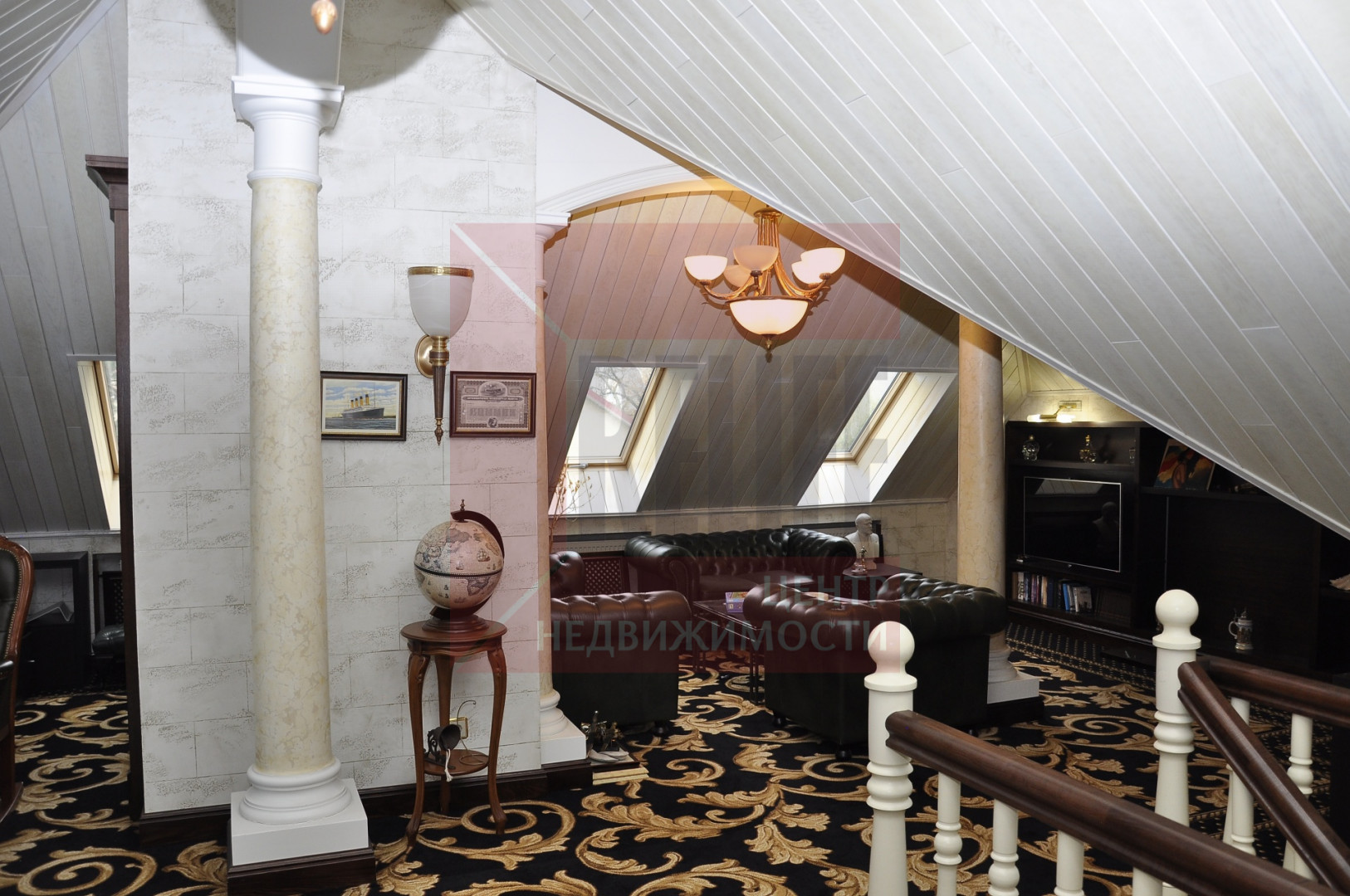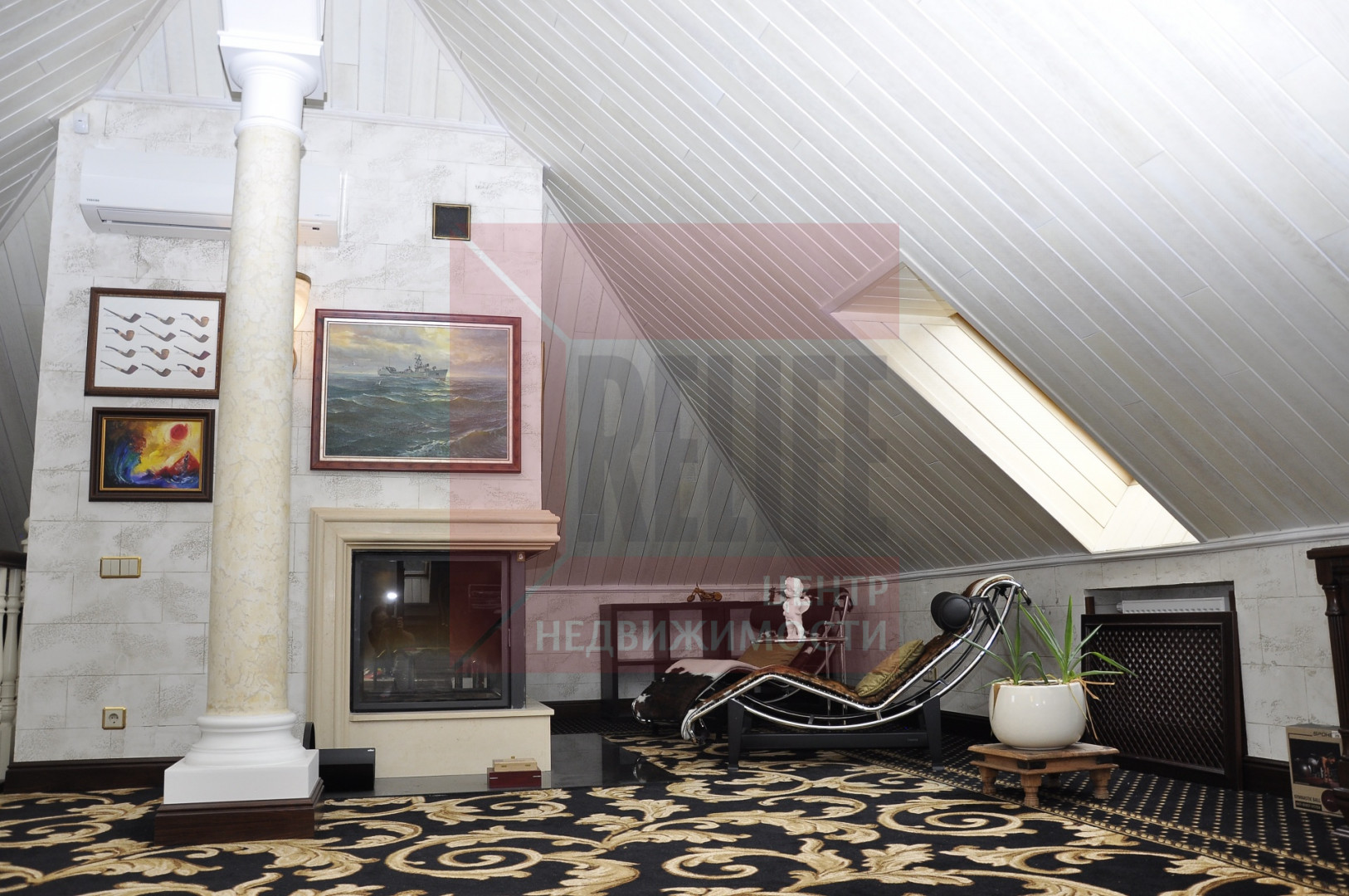 - мансарда: просторный кабинет с пространством для отдыха и камином.