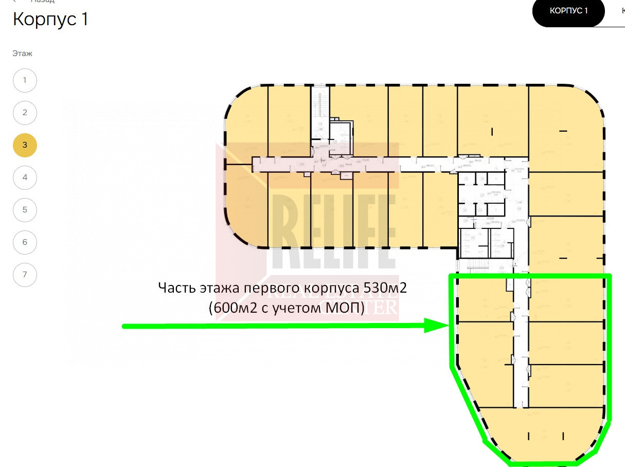 К аренде представлены офисные помещения крупными лотами от 1000 м² до этажей целиком и небольшими — от 35 м² до 150 м²: