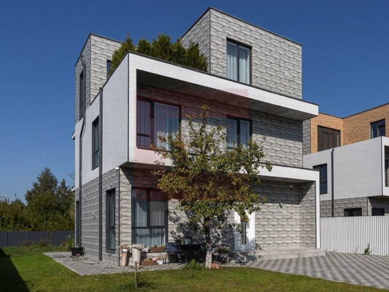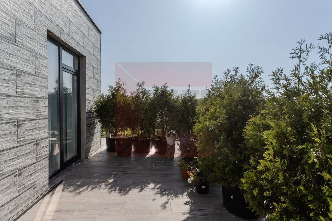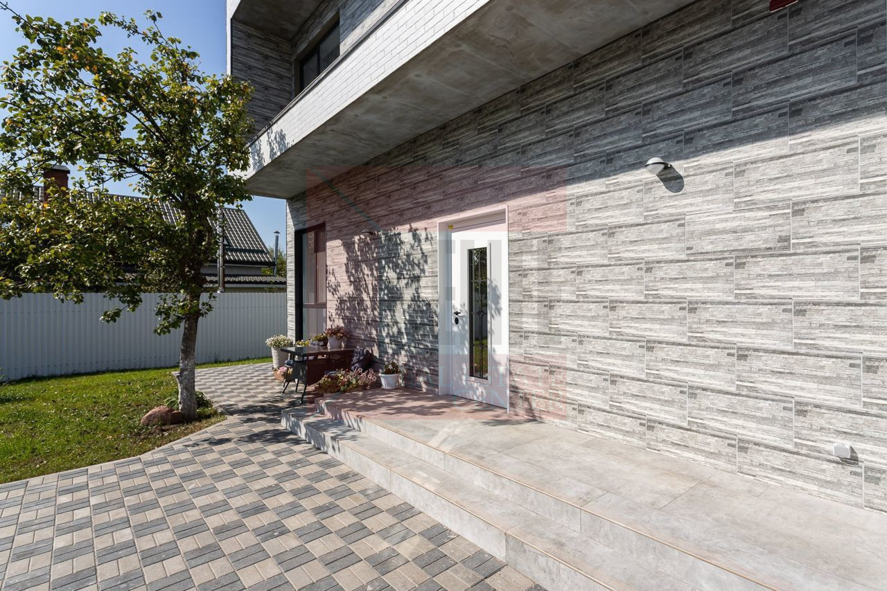 Дом располагается на земельном участке 7,3 соток в собственности. Высажен вечнозеленый газон и деревья, дорожки вымощены камнем, организована зона отдыха. Охрана и видеонаблюдение по периметру дома.