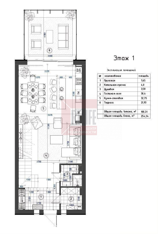 1 этаж: просторная гостиная 30.4 кв.м с выходом в круглогодичный зимний сад, кухня-столовая 32.75 кв.м, прихожая, гостевой санузел с душевой и техническая комната. Болшая остекленная терраса 21.93 кв.м.