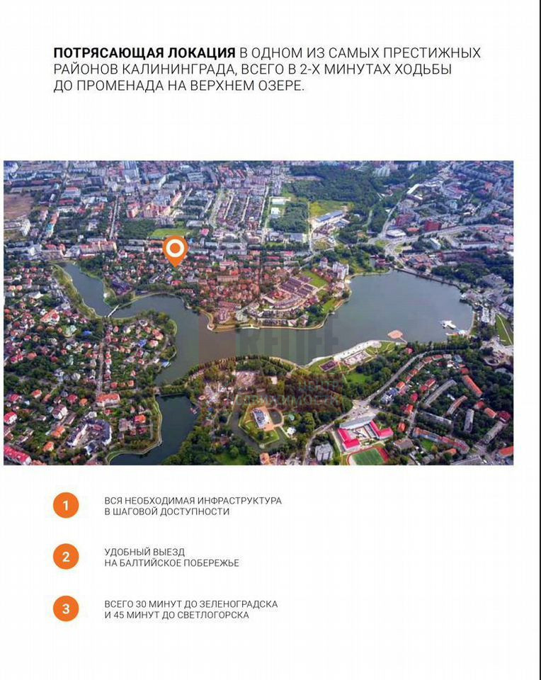 Дом шикарно расположение в центре города и в то же время вдали от суеты и шумных дорог. За пешей прогулкой по тихим улочкам вы не заметите как окажетесь на набережной «Верхнего» озера. Так же в шаговой доступности вся инфраструктура: магазины, аптеки, отделения почты и банков, торговые центры, несколько школ, фитнес-центр, ботанический сад, музеи, БФУ им. Канта, Музей Янтаря, Резиденция Королей. На автомобиле можно без проблем выехать в центр города, к морскому побережью, за город или в аэропорт. До основных магистралей Калининграда и скоростного Приморского кольца всего несколько минут езды.